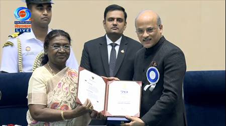 The Honourable President Of India, Smt. Droupadi Murmu Presented The Highest Award For Cinema In India, Today In New Delhi. Many Congratulations To Soorajji For This Milestone Win! BIG Celebration At @rajshrifilms!